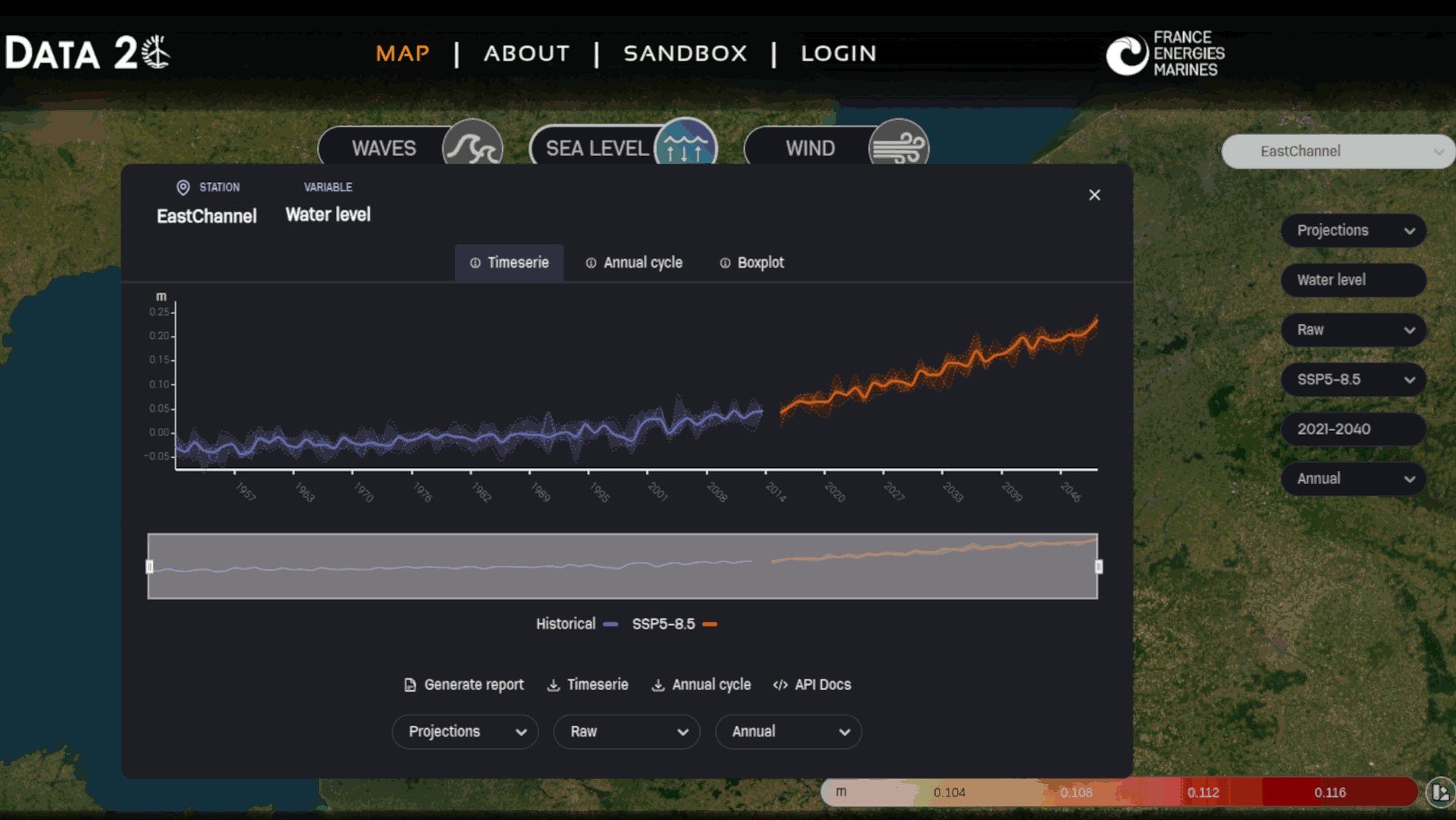 Tangencialmente relacionado con el anterior, el objetivo del visor 2Cnow, desarrollado para France Energies Marines, se centra en las previsiones de producción energética renovable instaladas en el mar y los posibles desafíos derivados del cambio climático, como el aumento del nivel del mar. Puedes explorarlo aquí.
